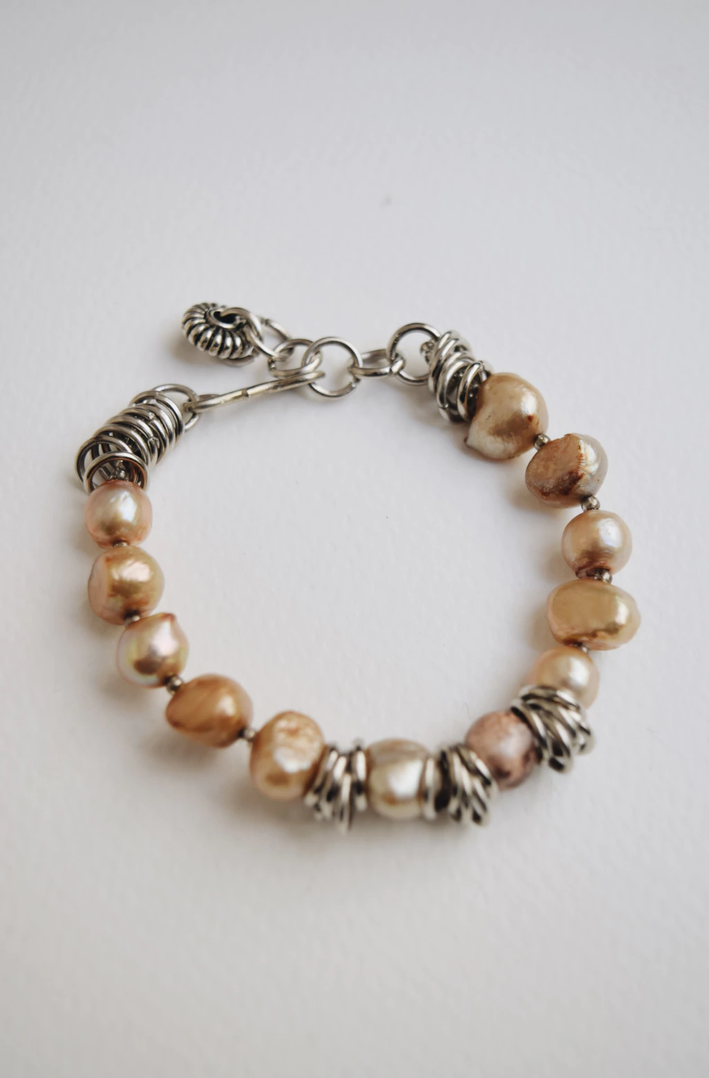 Descubrí la Pulsera Pupe Colette, un diseño único con perlas barrocas negras o rosas y delicados detalles en alpaca o bronce.